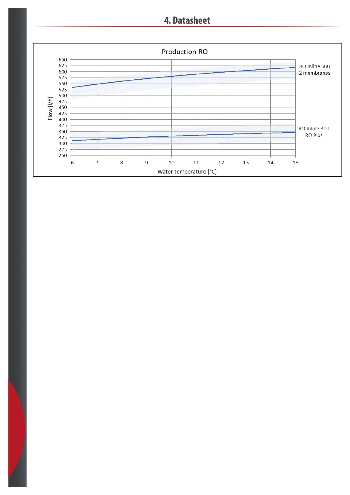 Average membrane performance compared to water temperature °C at 3 bars inlet pressure