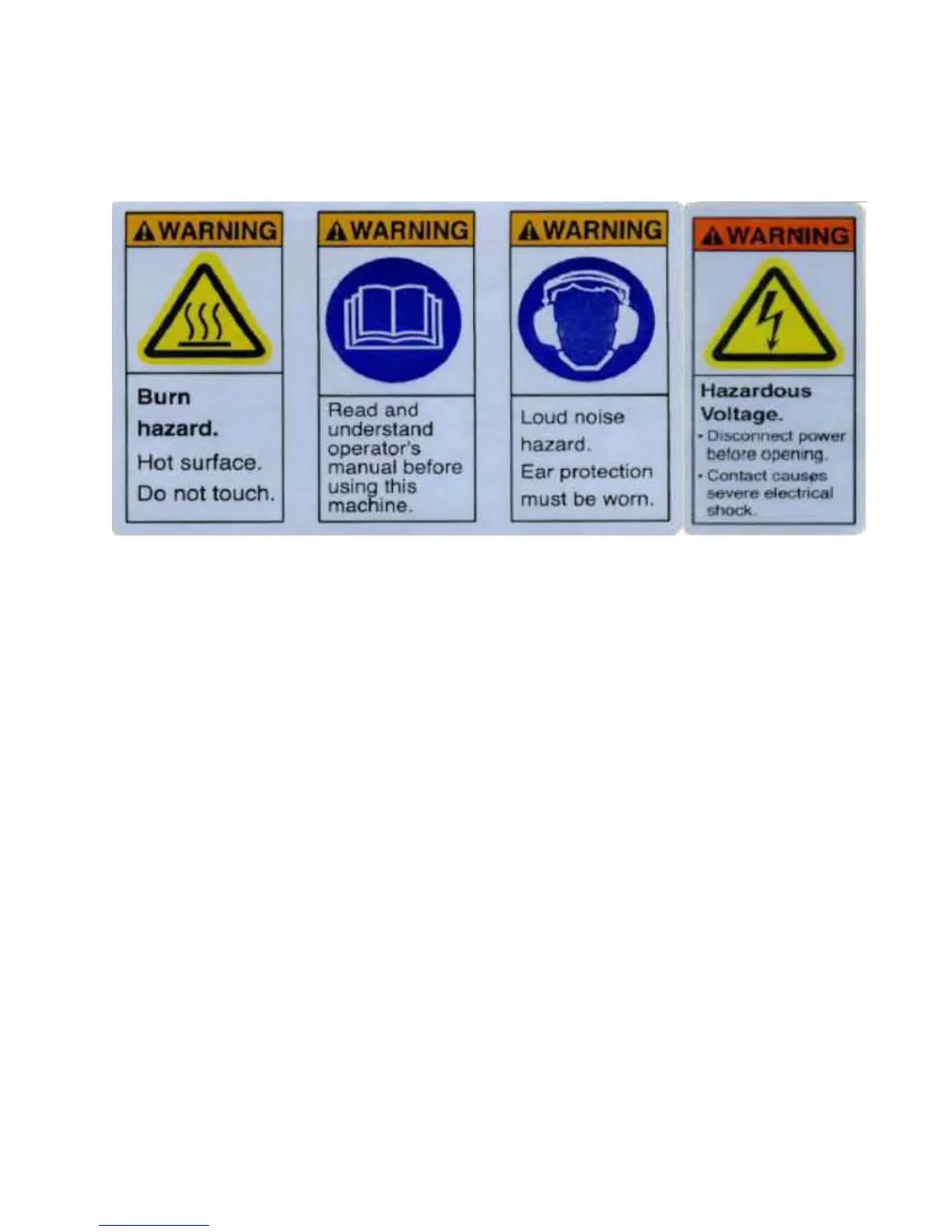 The warning labels shown above should be affixed on the top of the pump’s sound shield, except the