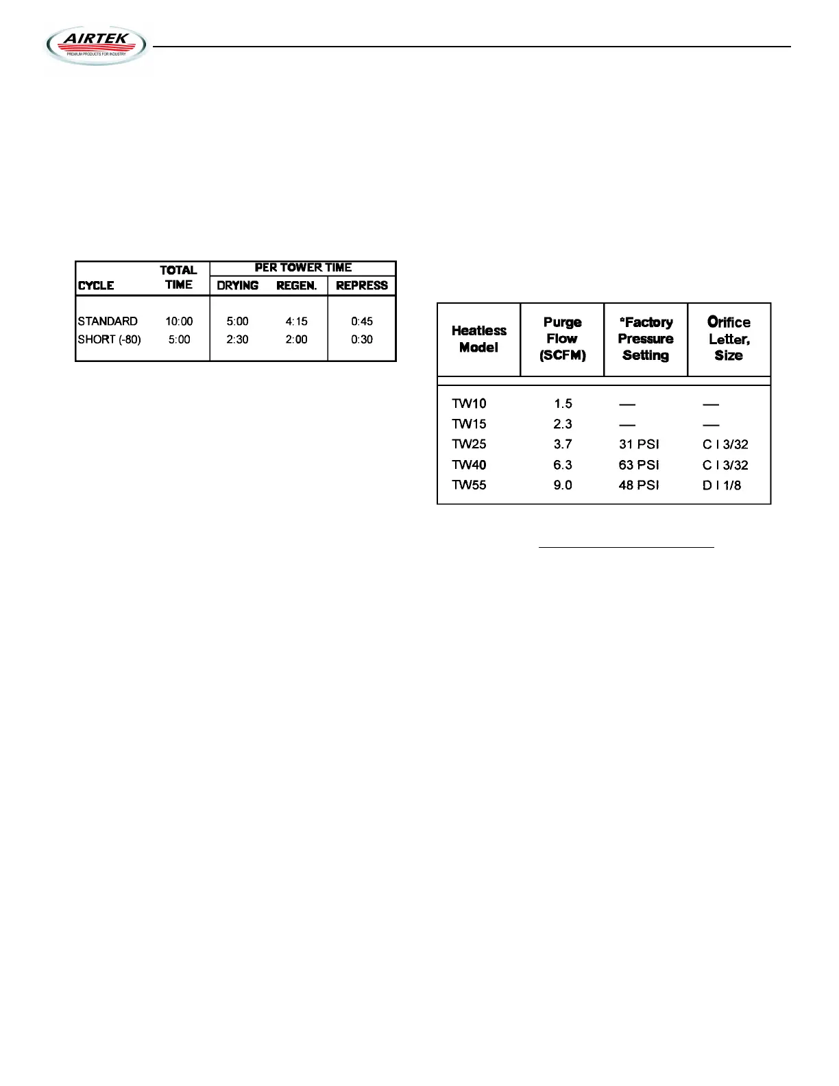 time cycles for applications requiring a –40 dewpoint and