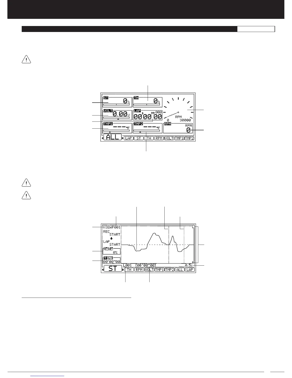 Use the SELECT switch to switch between ALL and LAP, ST, TH, RPM, VOLT, TMP1 and TMP2 pages. These pages display more