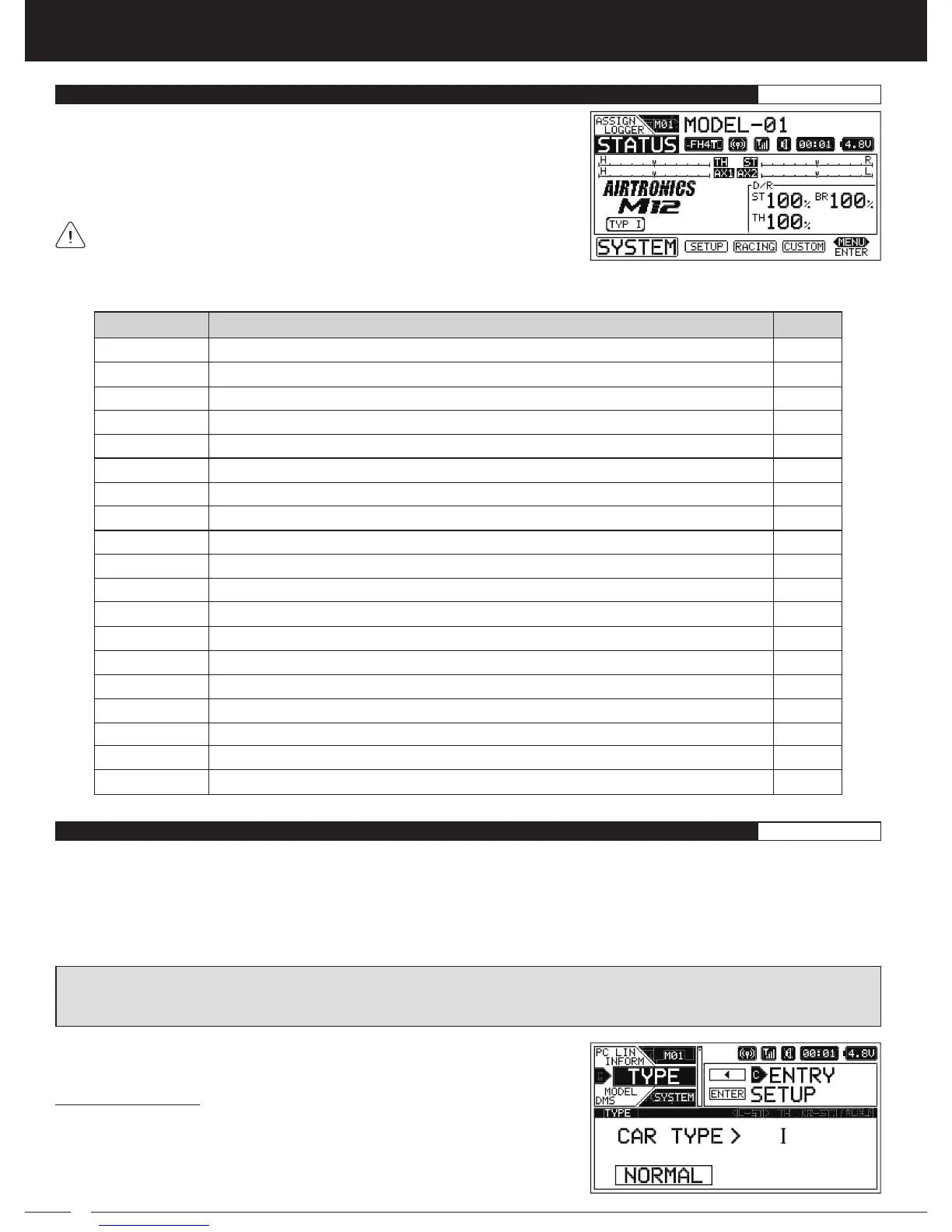 WARNING: TYPE menu selections are designed to be used when setting up a new Model and should be done prior to