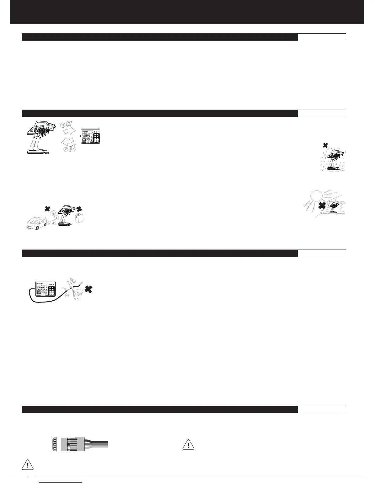 • There is a danger of runaway operation if connectors shake loose during use. Make sure that the receiver, servo(s) and switch