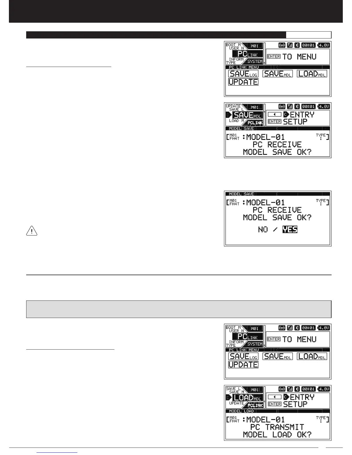 5) Press the ENTER key. PC RECEIVE MODEL SAVE OK? NO/YES will be displayed.