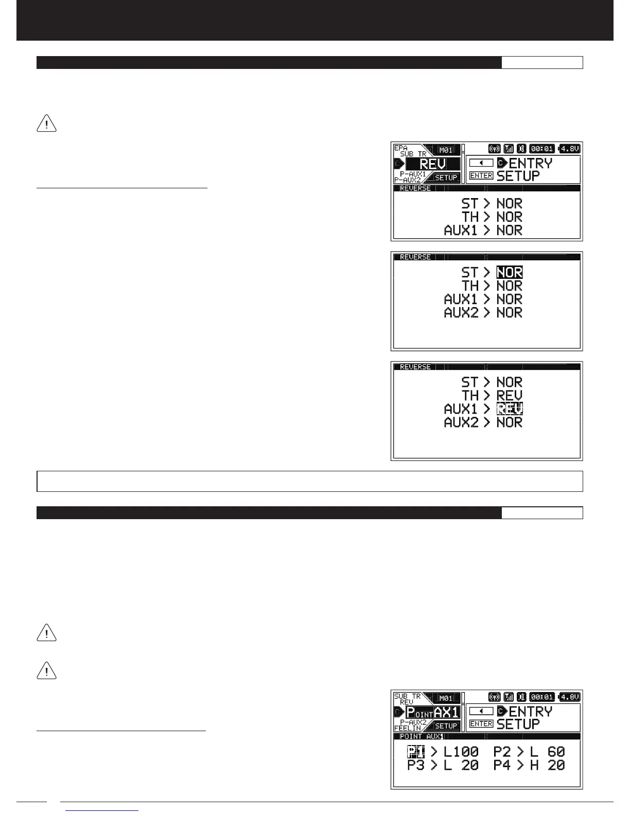 ST, TH, AUX1 and AUX2 setting range is NOR and REV. The default setting for all channels is NOR.