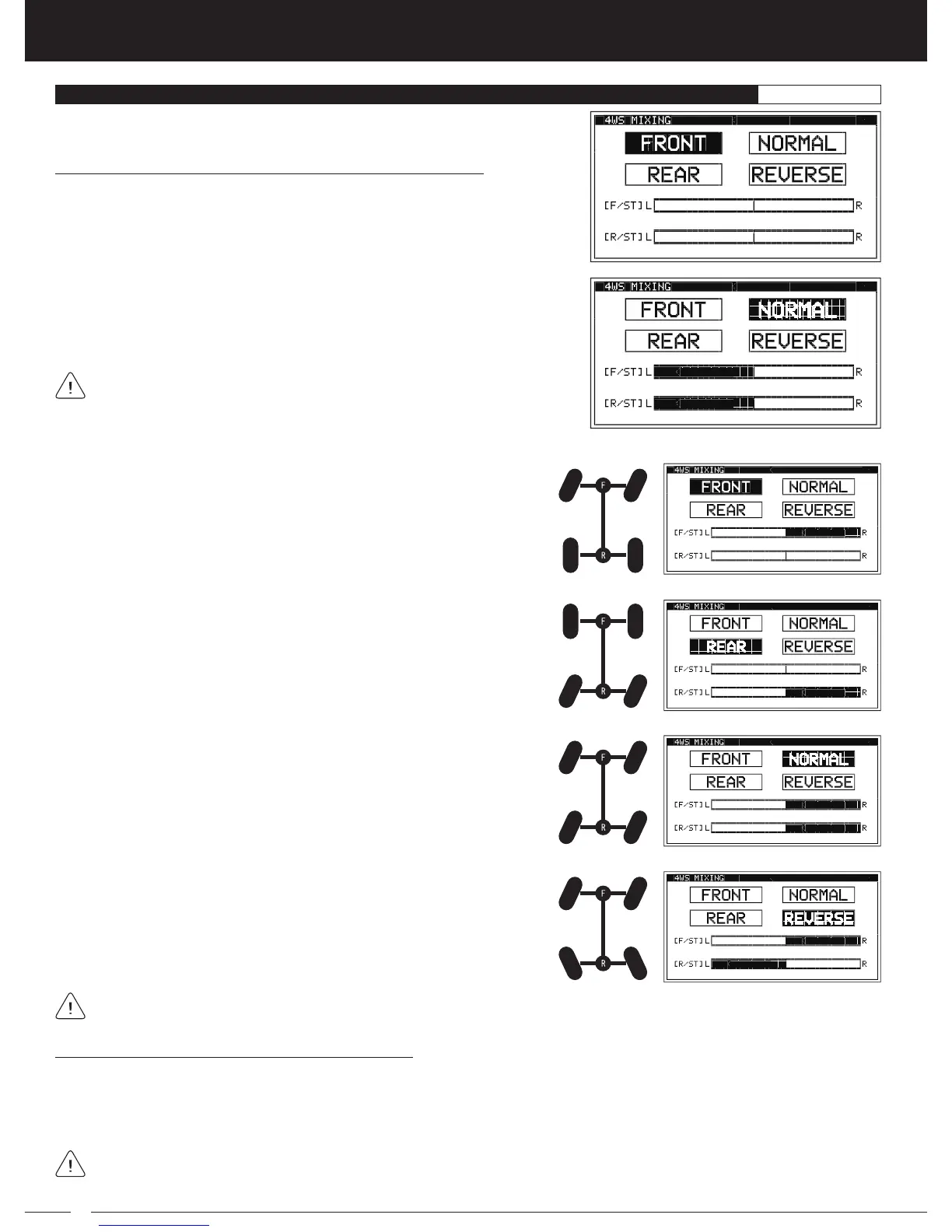 1) In order to control the Four Wheel Steering function, the 4WS MIX function must be Assigned to either one of the five Trim