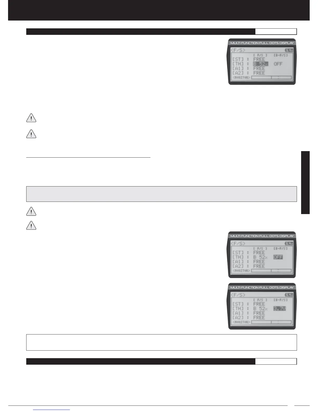 F/S B-F/S setting range for FH4T receivers is OFF and 3.5V to 7.4V. F/S B-F/S setting range for FH3 receivers is OFF and