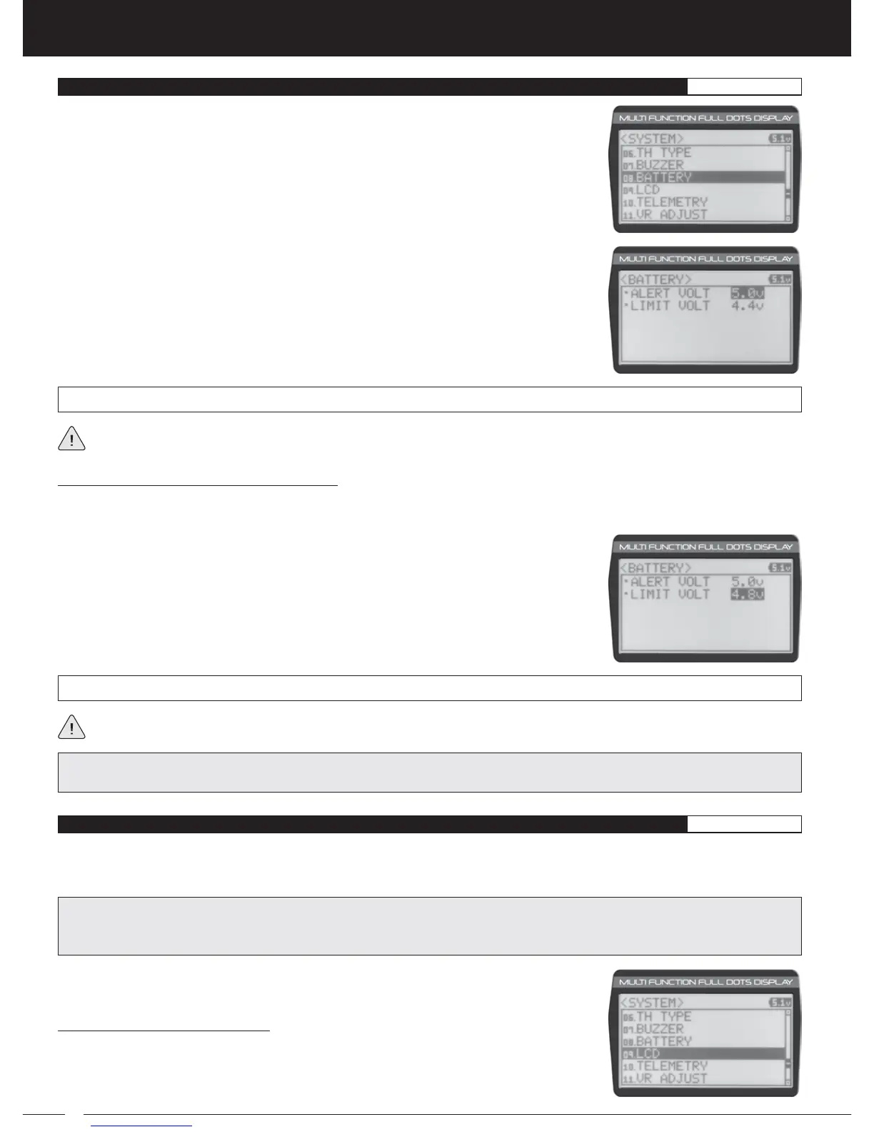 WARNING: Continuing to use the transmitter after the Low Voltage Limit alarm sounds can result in loss of control of your