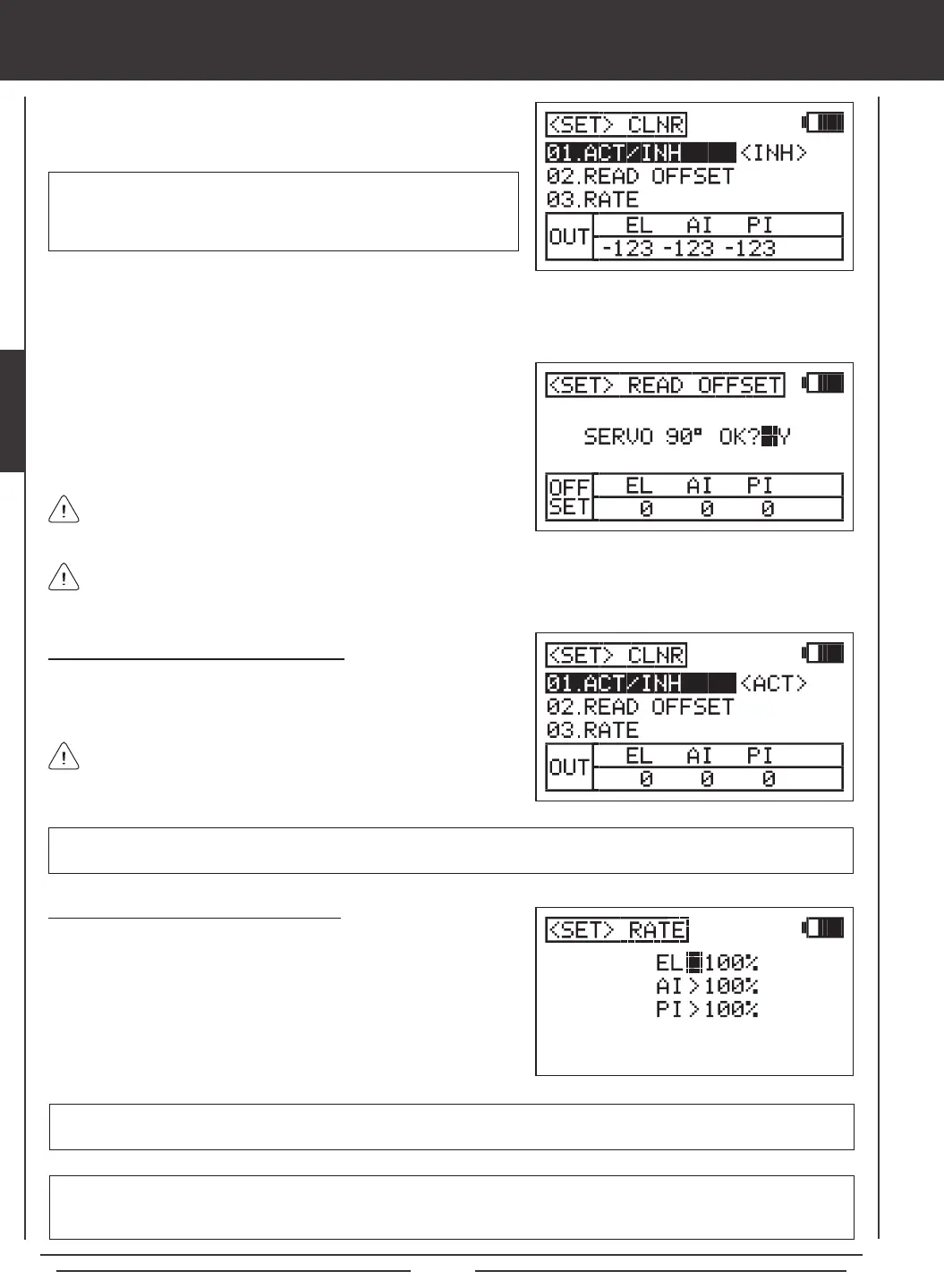 the <SET>CLNR menu. When both control sticks are centered all values will read zero. With the control sticks centered, the
