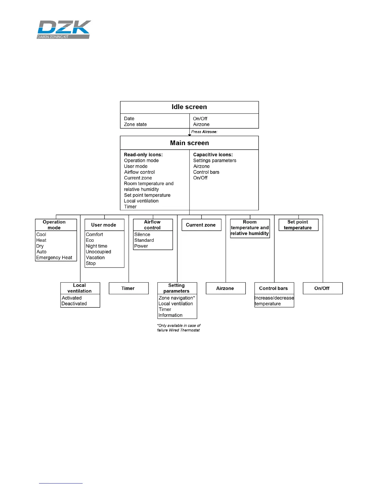 Airzone DZK - Wireless Thermostat Navigation Chart
