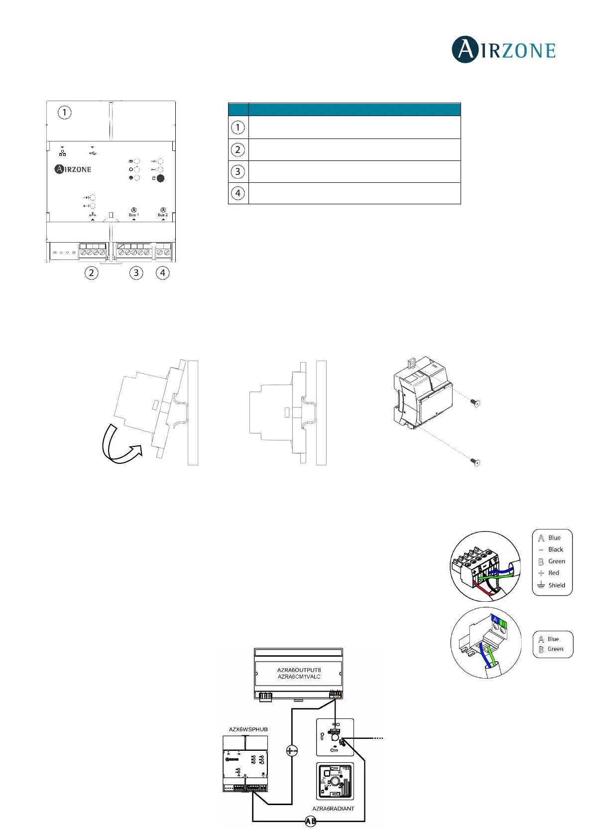 Webserver HUB. Fix the cables with the screws on the terminal, following the color code.