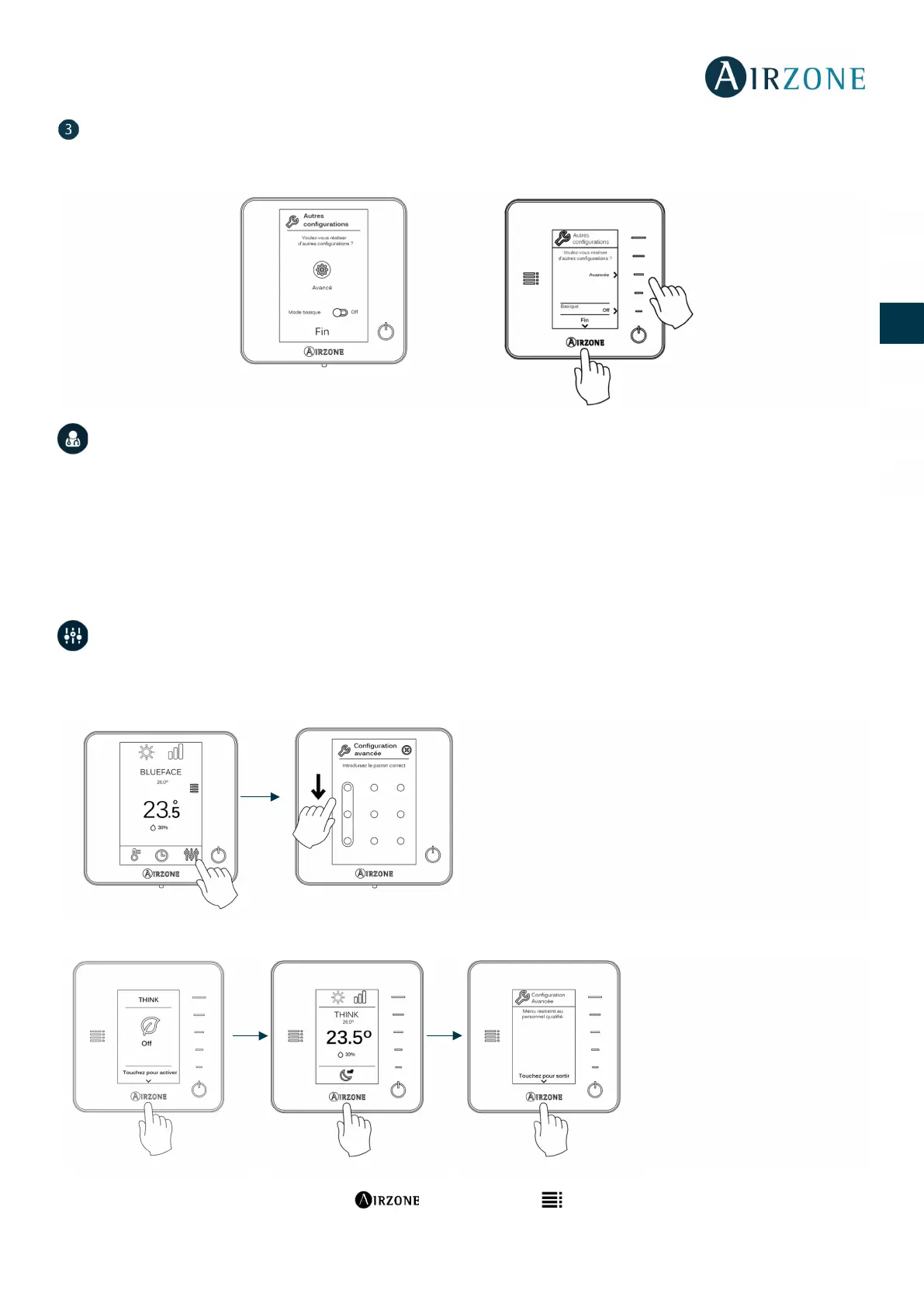Attention : Sur les thermostats Think, utilisez pour confirmer et pour revenir en arrière, lorsque vous êtes dans