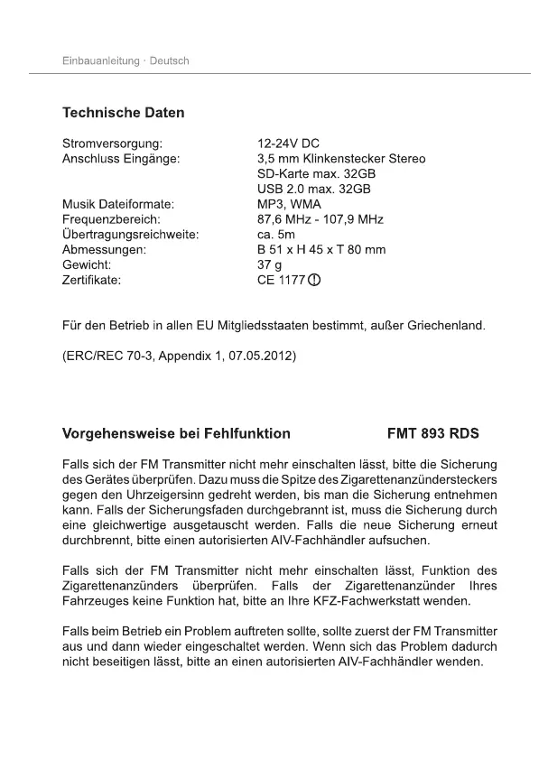 AIV FMT 893 RDS - FM Transmitter Technical Data; FM Transmitter Malfunction Guide