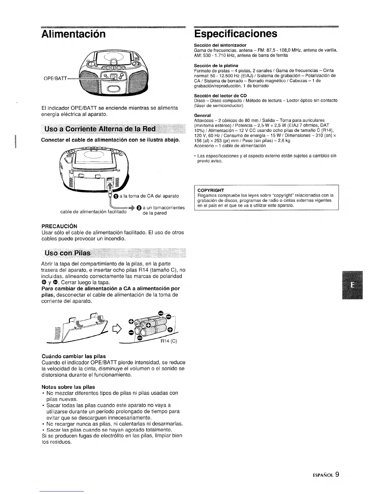10%) / Alimentacion -12 V CC usando echo pilas de tamafio C (R14),
