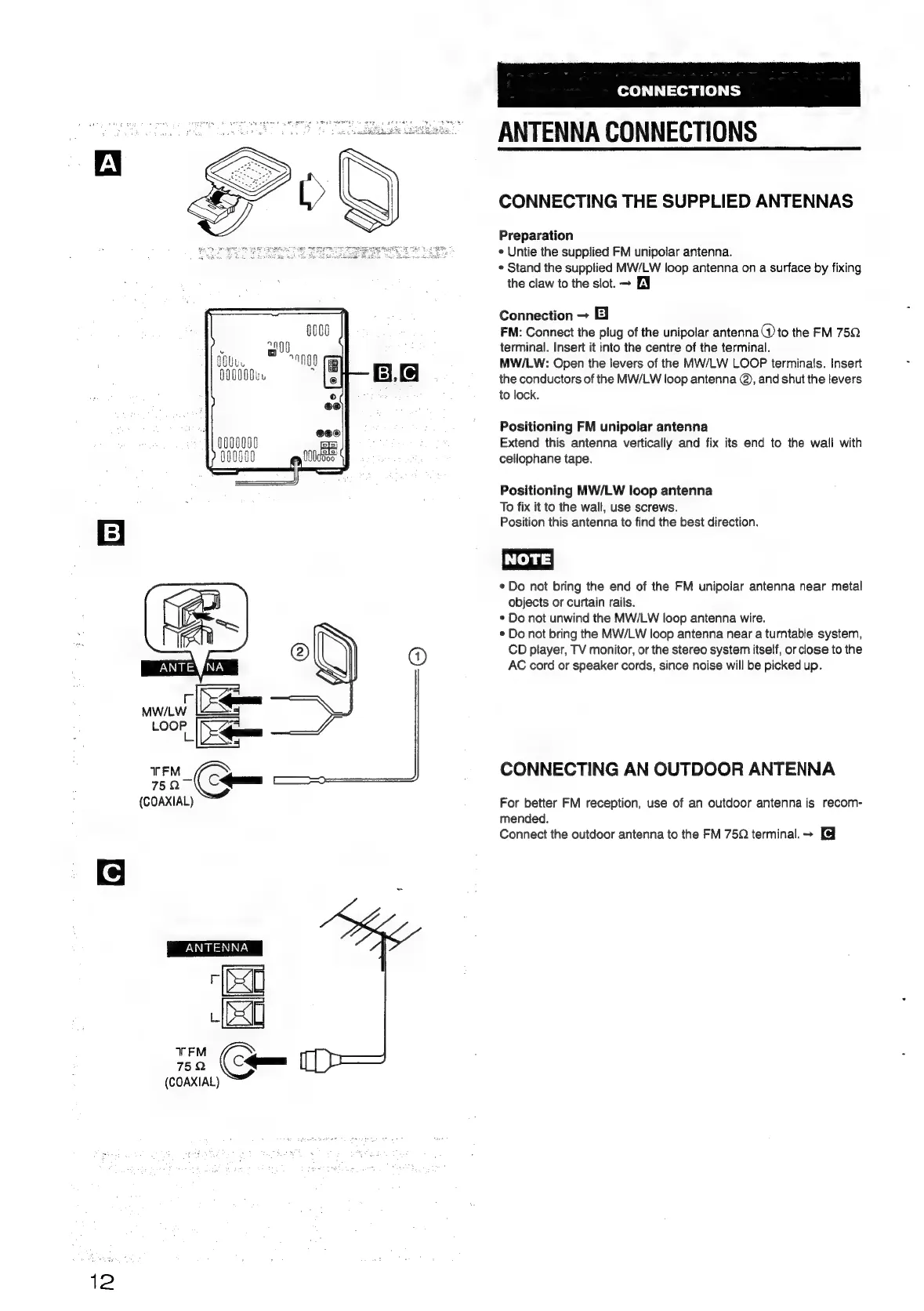 Aiwa NSX-430 - ANTENNA CONNECTIONS; CONNECTING THE SUPPLIED ANTENNAS; Positioning FM unipolar antenna; Positioning MW;LW loop antenna