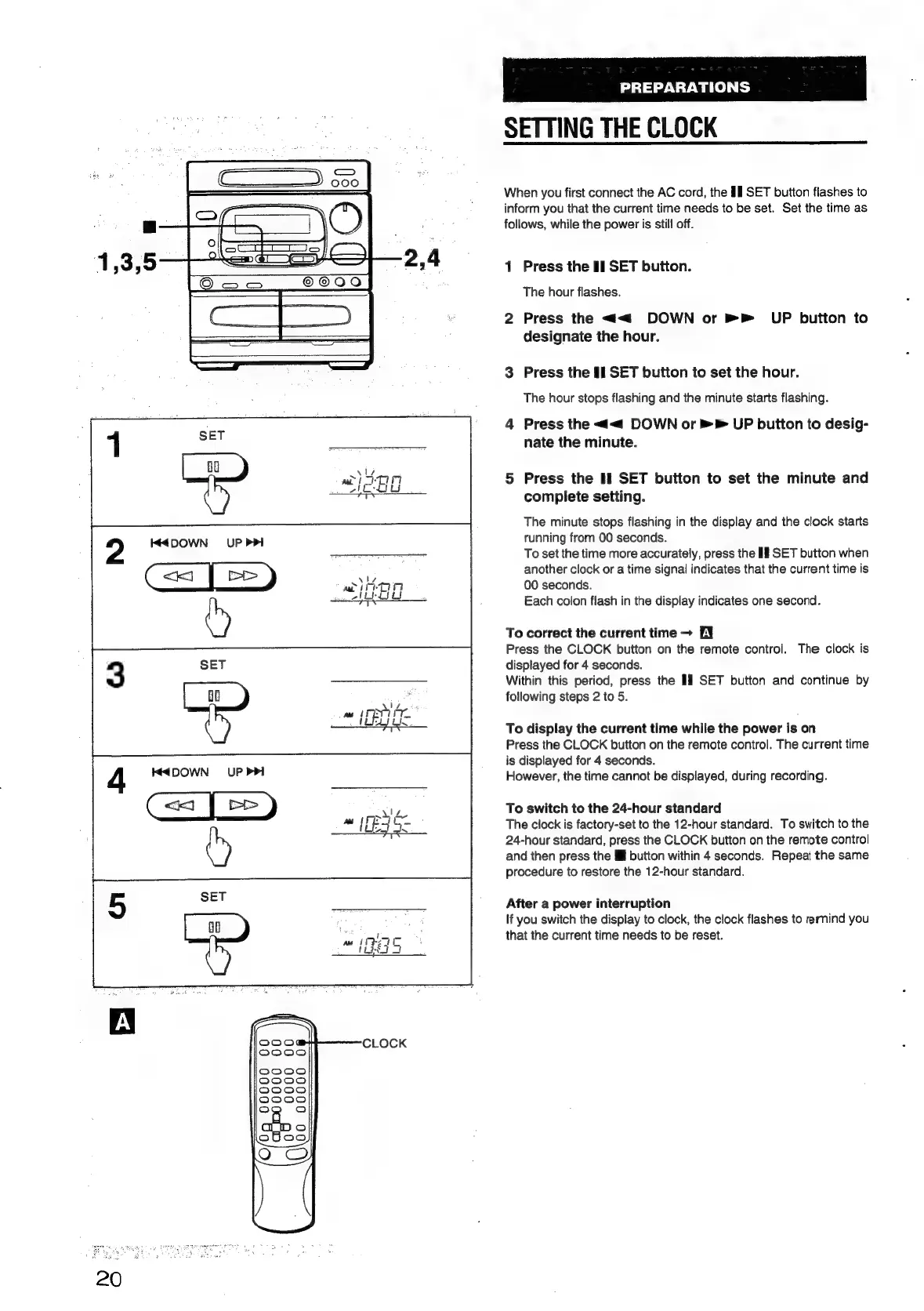 Aiwa NSX-430 - SETTING THE CLOCK; To correct the current time; To display the current time while the power is on; To switch to the 24-hour standard