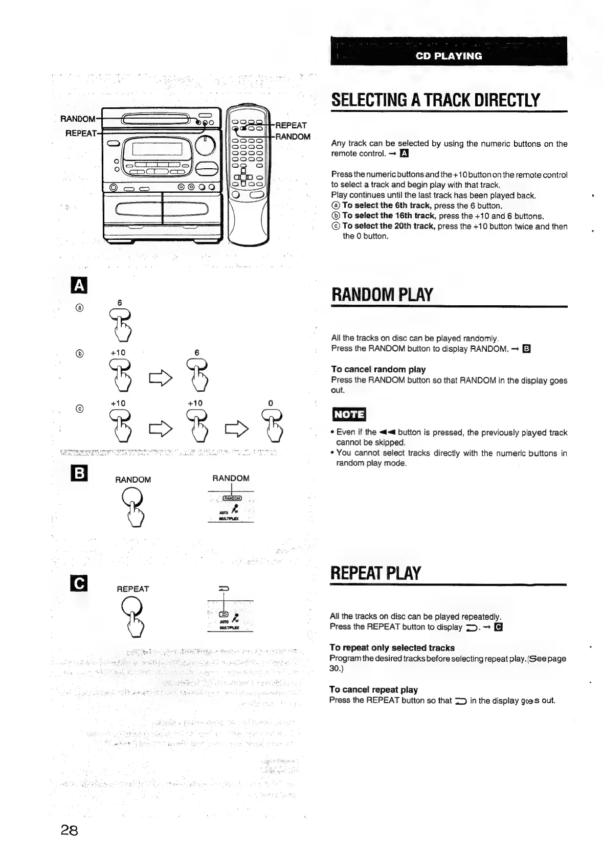 Aiwa NSX-430 - SELECTING A TRACK DIRECTLY; RANDOM PLAY; REPEAT PLAY
