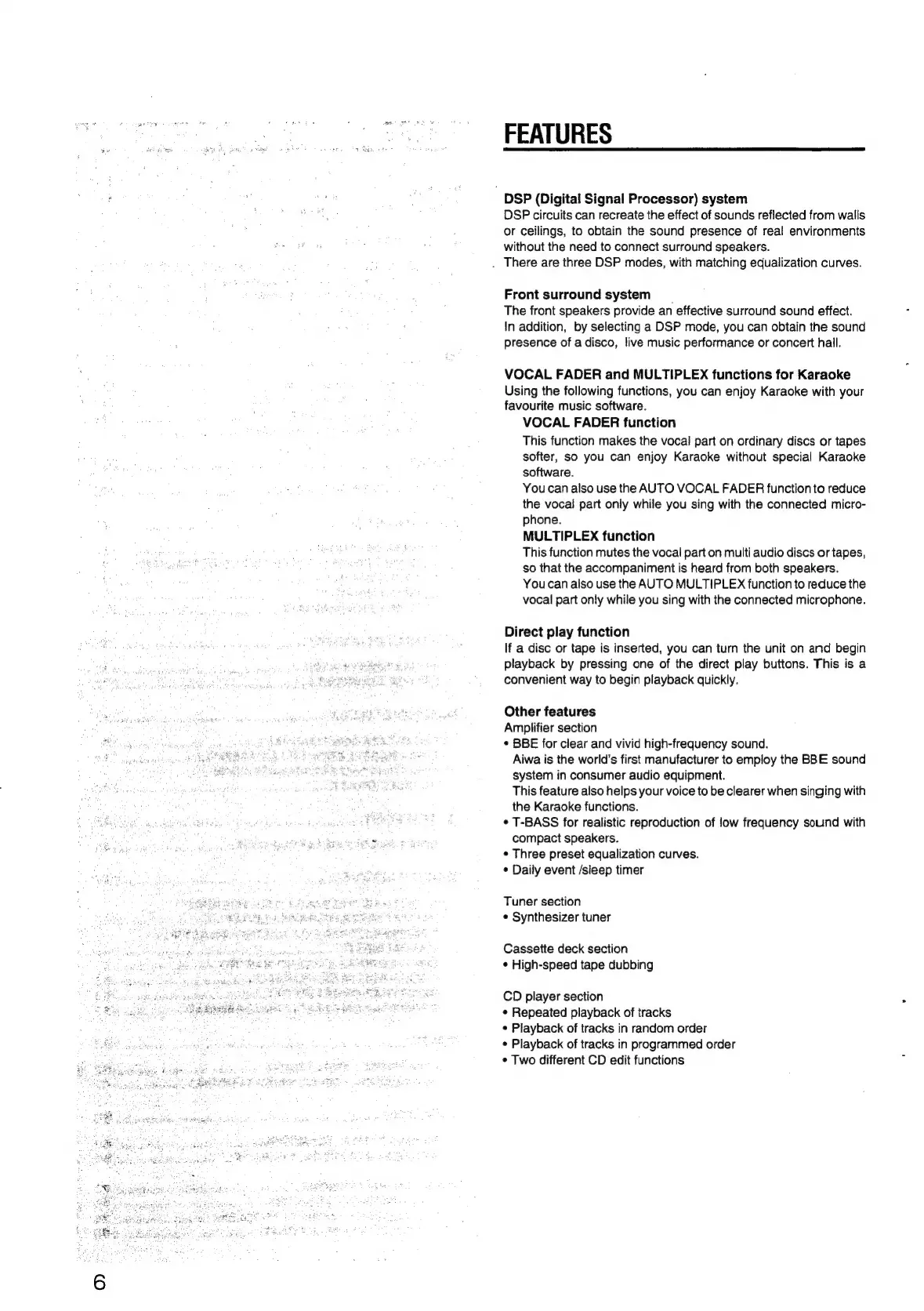 Aiwa NSX-430 - FEATURES; DSP (Digital Signal Processor) system; Front surround system; VOCAL FADER and MULTIPLEX functions for Karaoke
