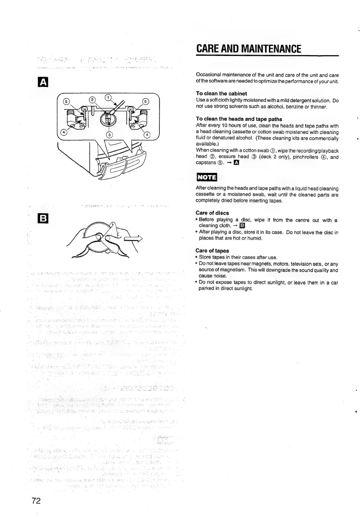 Aiwa NSX-430 - CARE AND MAINTENANCE; To clean the cabinet; To clean the heads and tape paths; Care of discs
