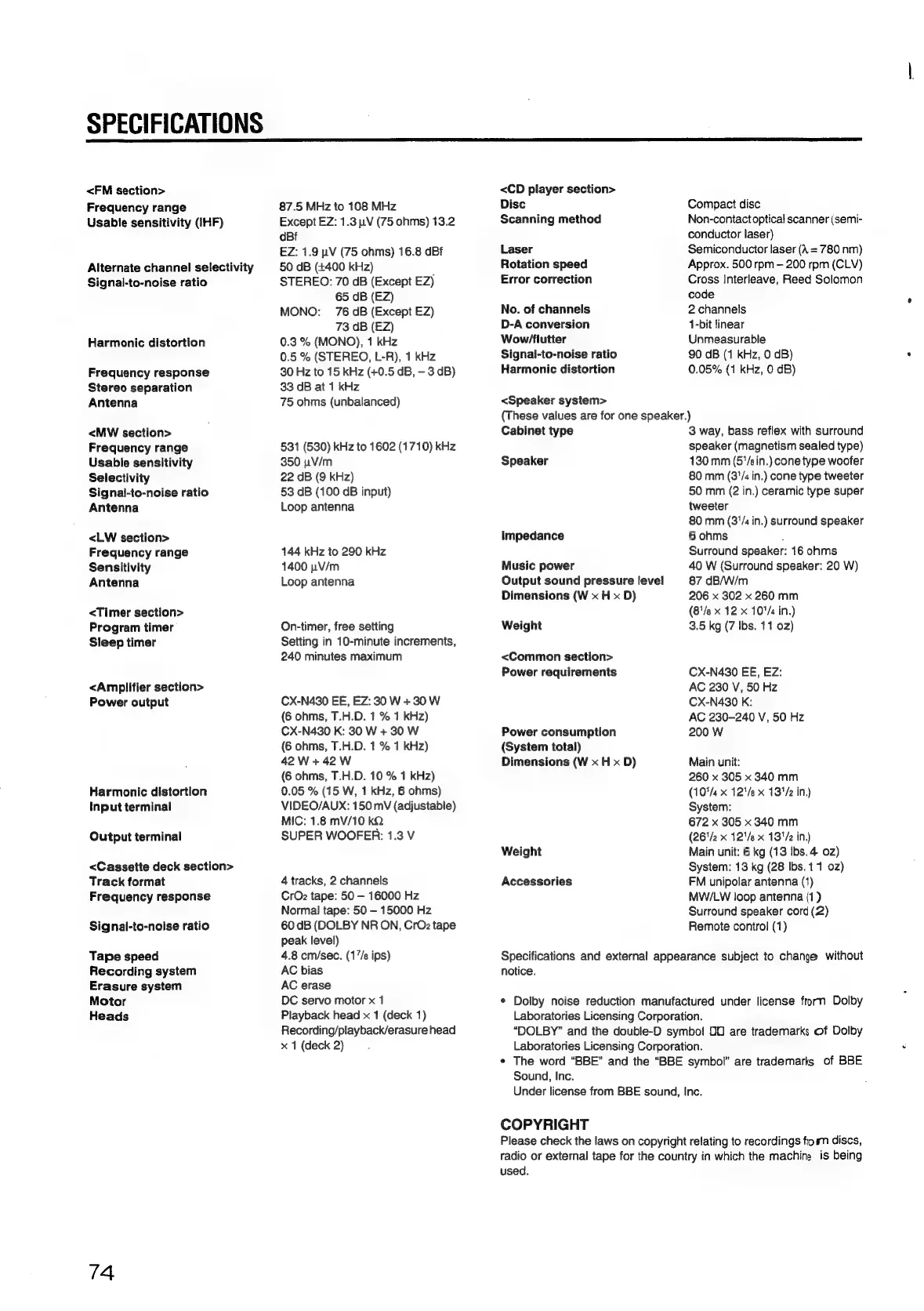 Aiwa NSX-430 - SPECIFICATIONS; FM section; MW section; LW section