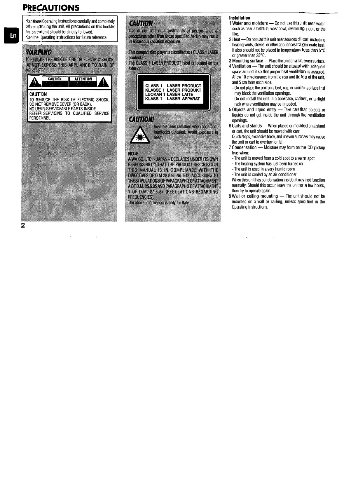 Aiwa NSX-SZ310 - Precautions and Safety; Safety Warnings; Installation Guidelines