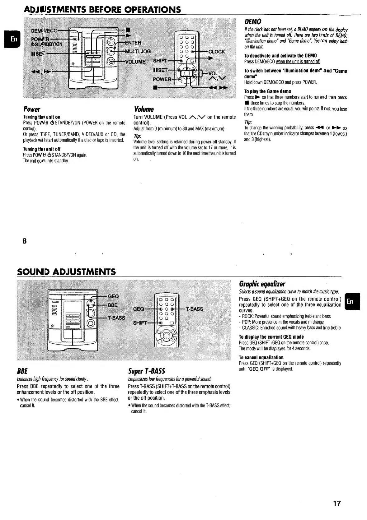 Aiwa NSX-SZ310 - Adjustments Before Operations; DEMO Mode Control; Power and Volume Control; Sound Adjustments
