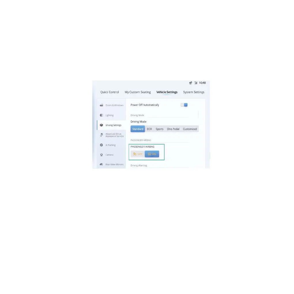 PATH: VEHICLE Settings - Driving Settings - Passenger AIRBAG