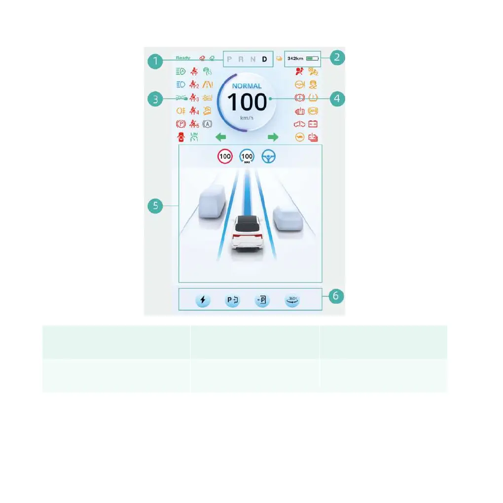 1. Gear display area 2. Battery/range display area