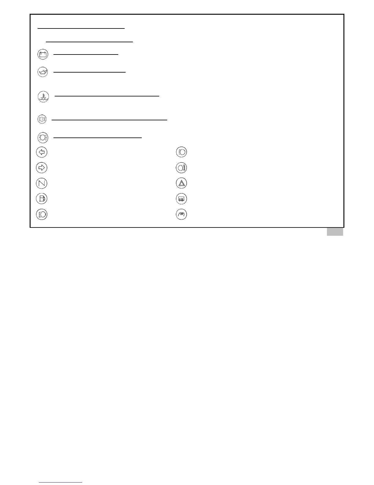 Cooling liquid temperature alarm indicator: It lights up in the ignition position and should switch off as soon as the engine