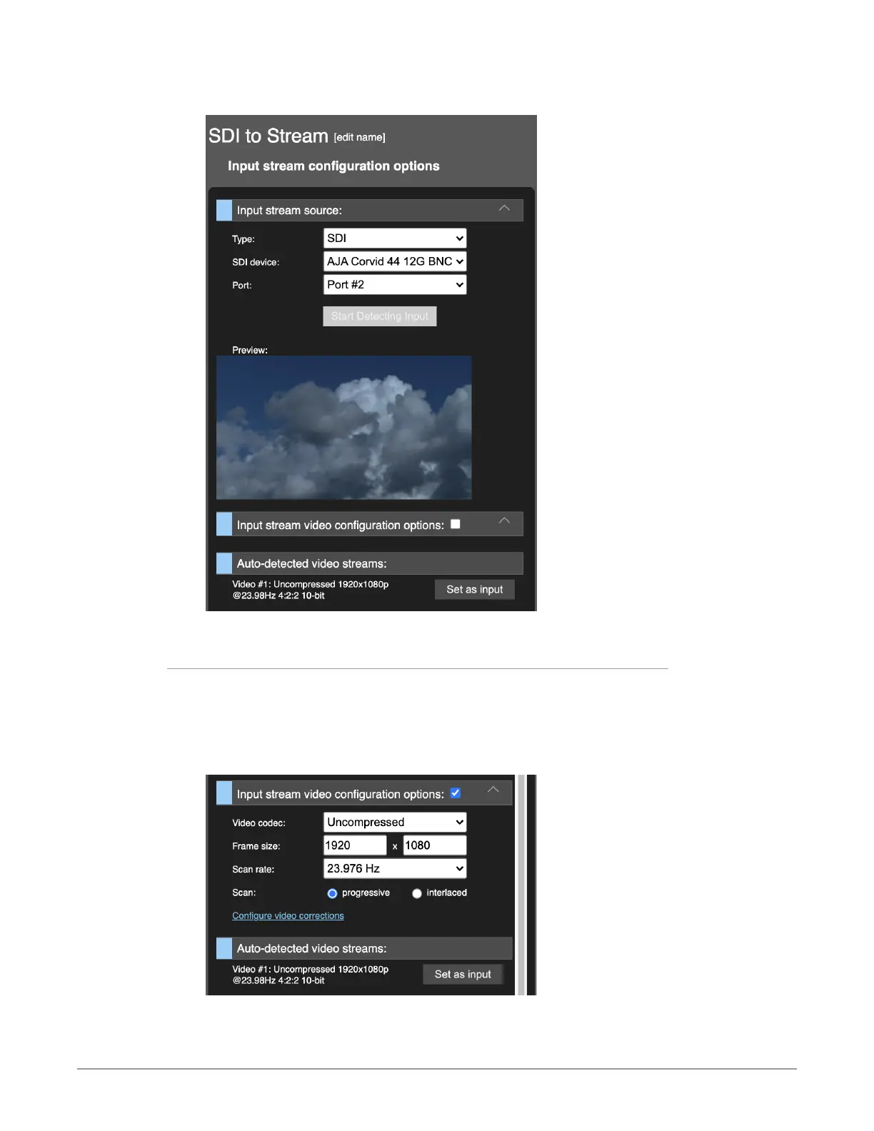 heading just above—"Input stream video configuration options"—expands and