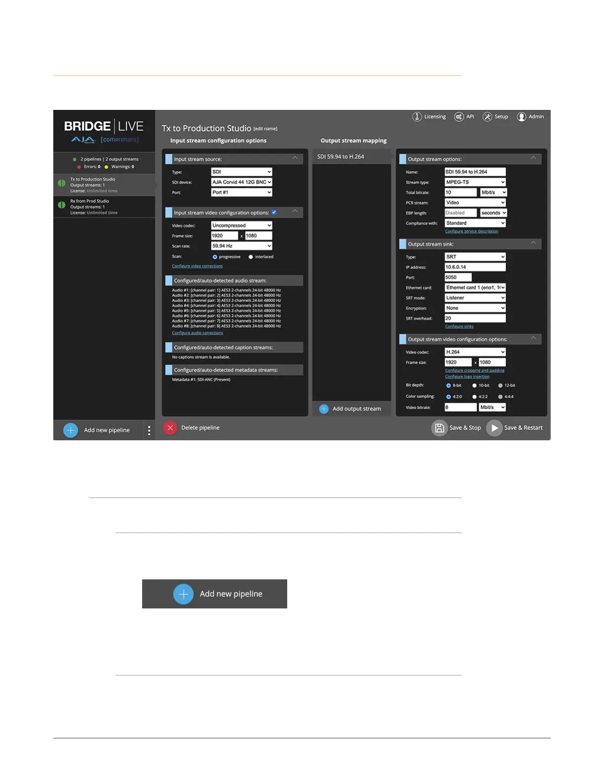 From the Remote Truck BRIDGE LIVE Dashboard, click Add new pipeline in the