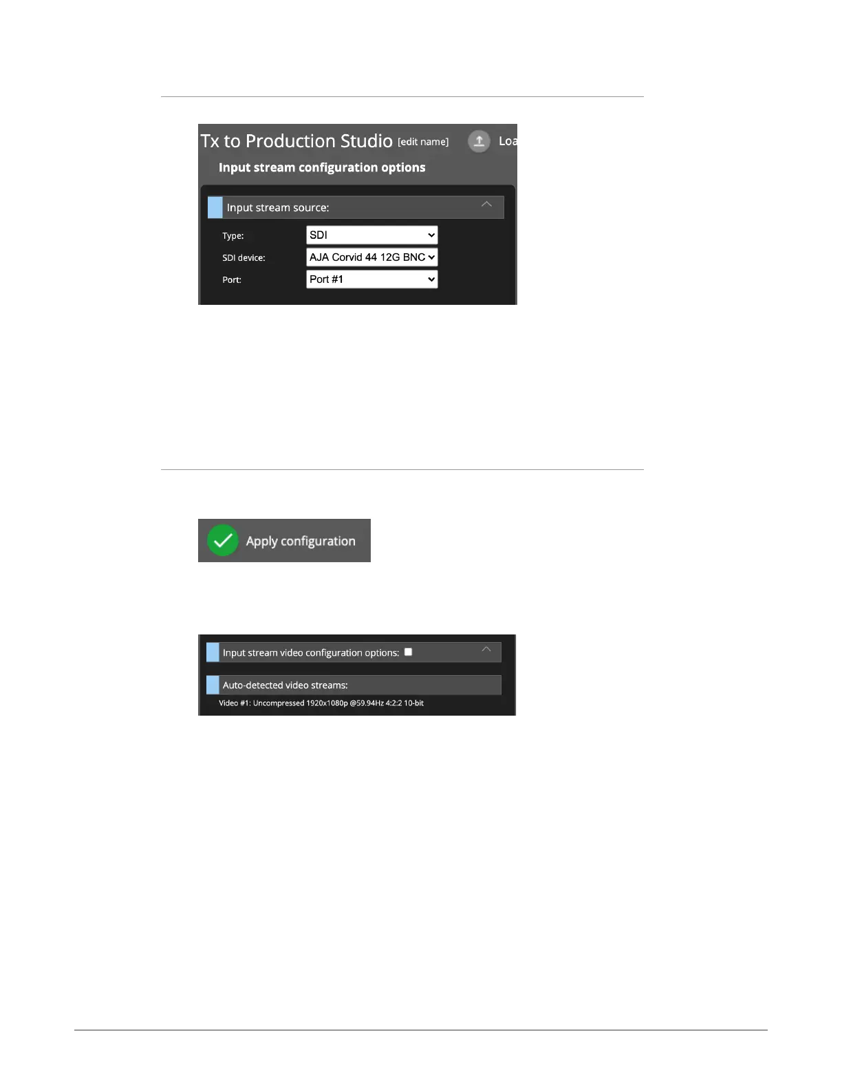 For the Input stream configuration options, make selections for Type, SDI device,