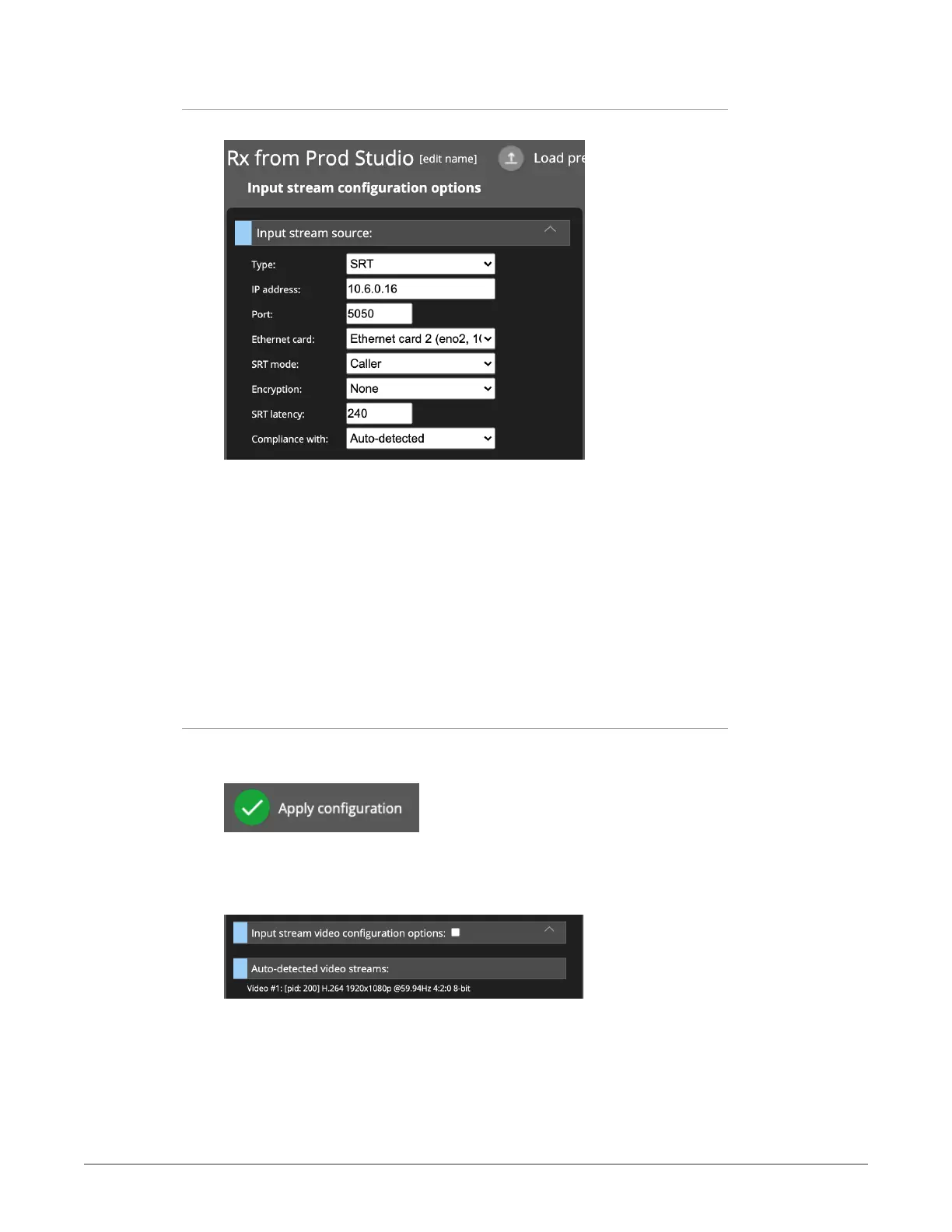 Click the signal that is listed. The Input stream video configuration options