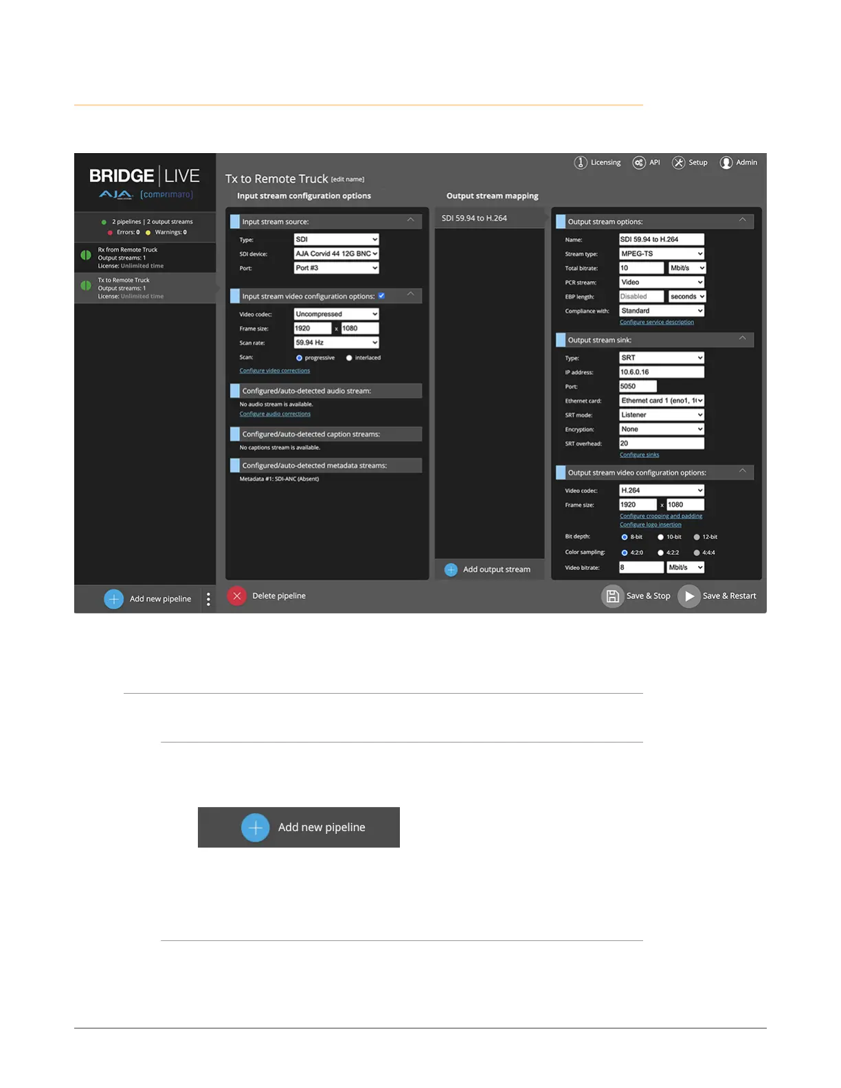 From the Production Studio BRIDGE LIVE Dashboard, click Add new pipeline in