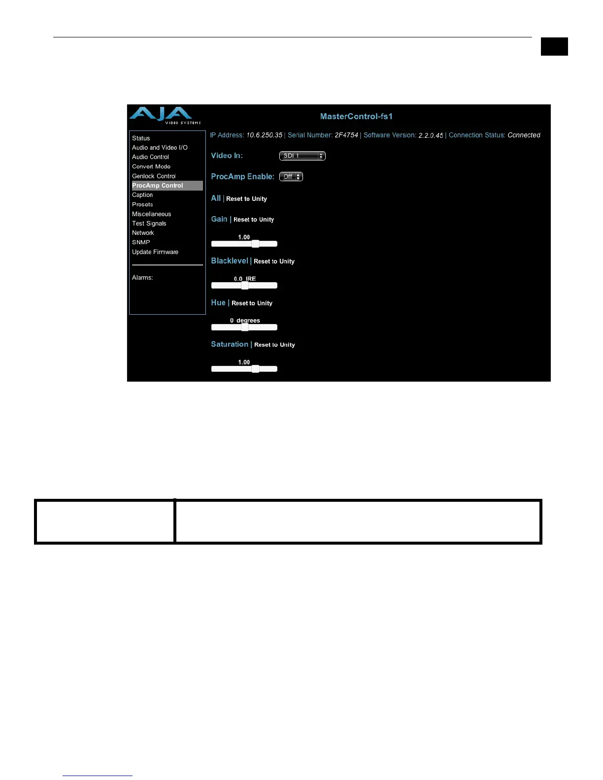 Video In—Selecting a value results in the ProcAmp screen showing the current ProcAmp
