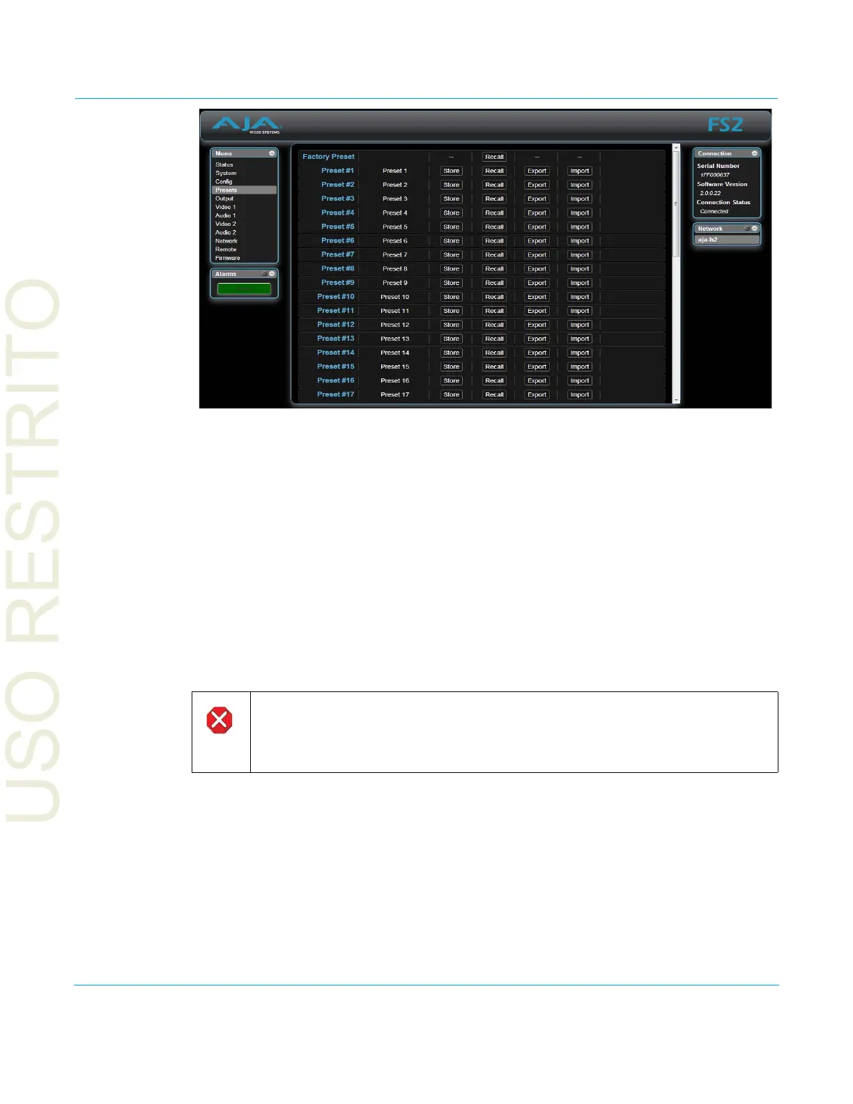 importing exported preset files from your computer. A displayed message indicates