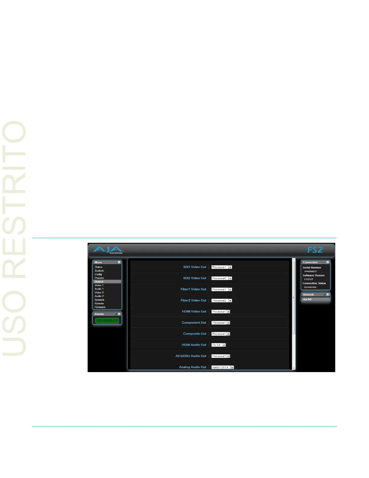 The Output screen selects the video and audio outputs that are routed to the FS2 rear