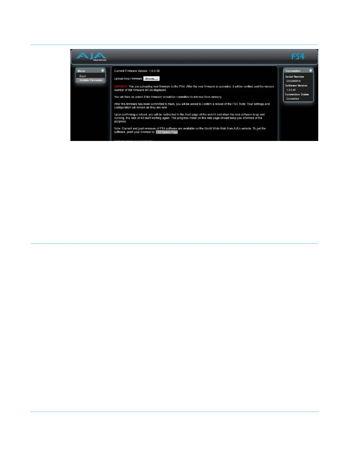 The FS4 Update Page link on the Firmware screen will take you to the correct AJA website
