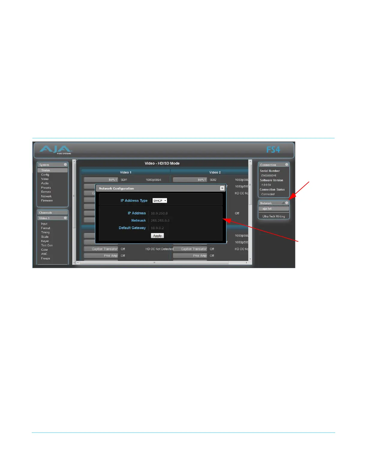 The Network pane on the right side of any screen lists the AJA FS devices that appear on