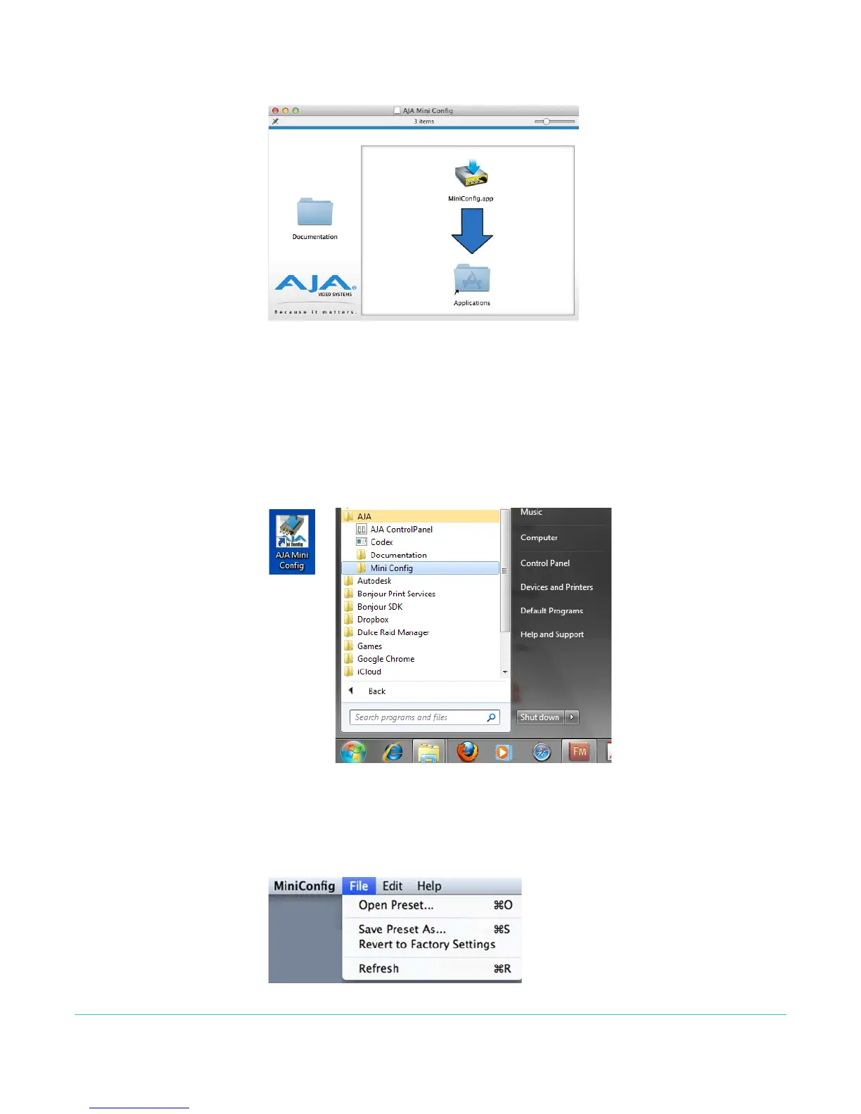 Mac Startup To run Mini-Config on a Mac, open the Applications folder and locate the AJA Mini-