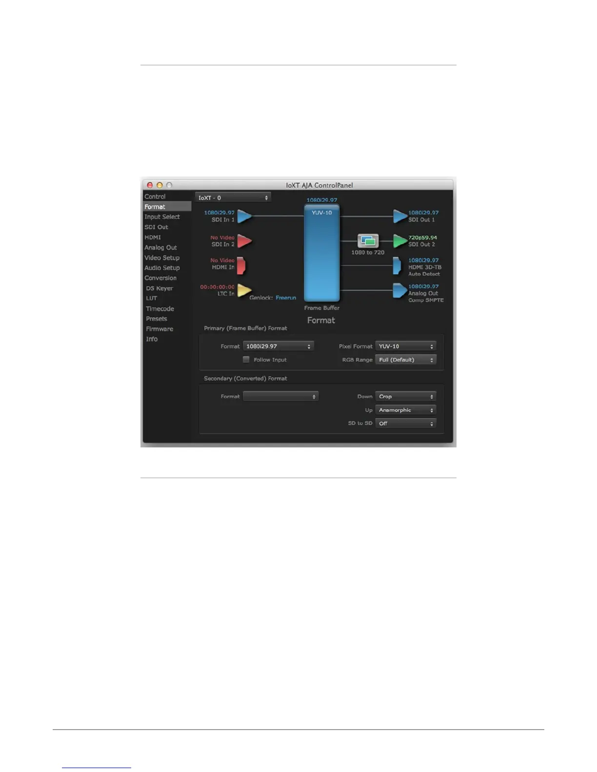 Figure 11. AJA Control Panel, Formats Screen, Io XT Cross-Conversion