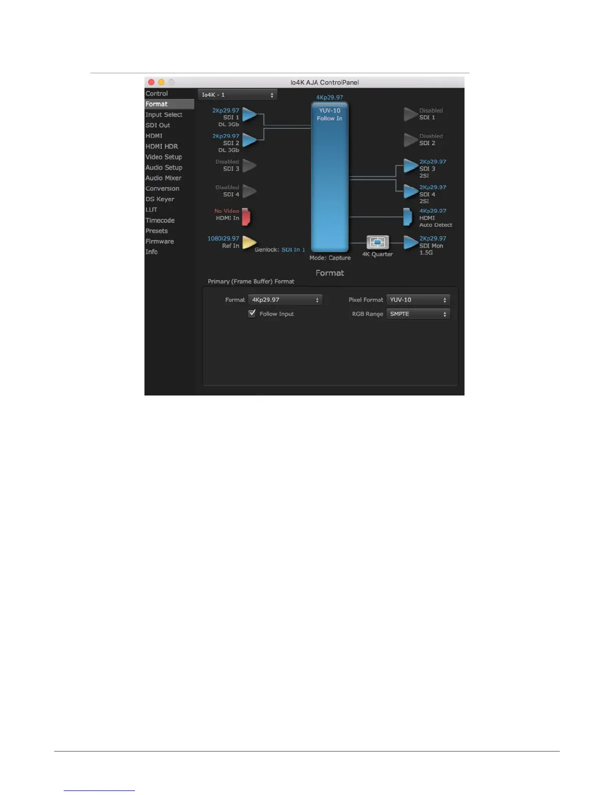 In 4K Mode the Io 4K Format Screen is the same as Io XT (see "Format Screen" on