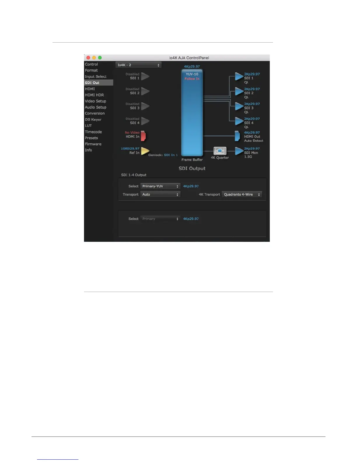 NOTE: The 4K Transport setting also affects the IO 4K HDMI output signal, even if the SDI