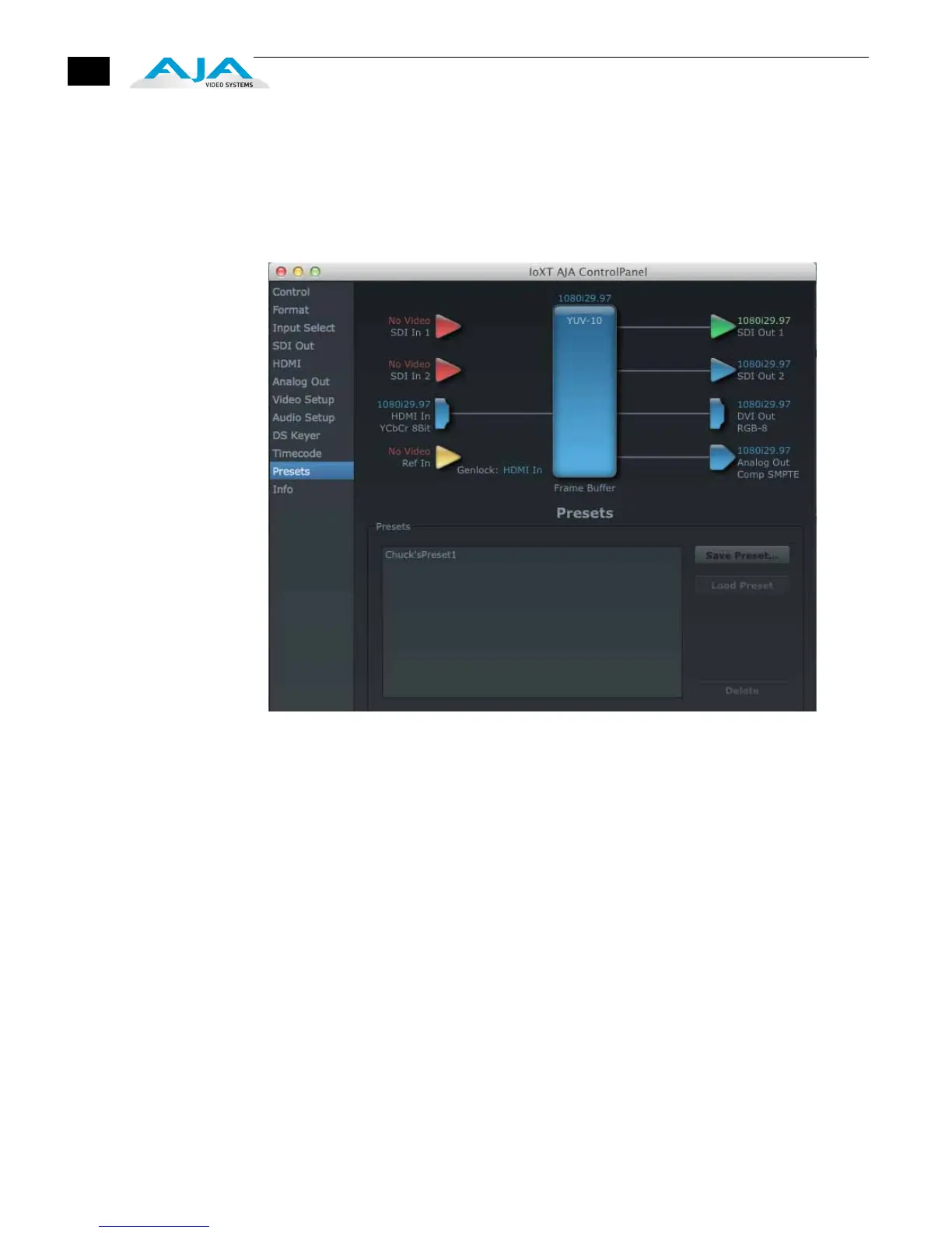 Presets Screen After configuring the AJA Control Panel Tabbed screens, you can then save all your