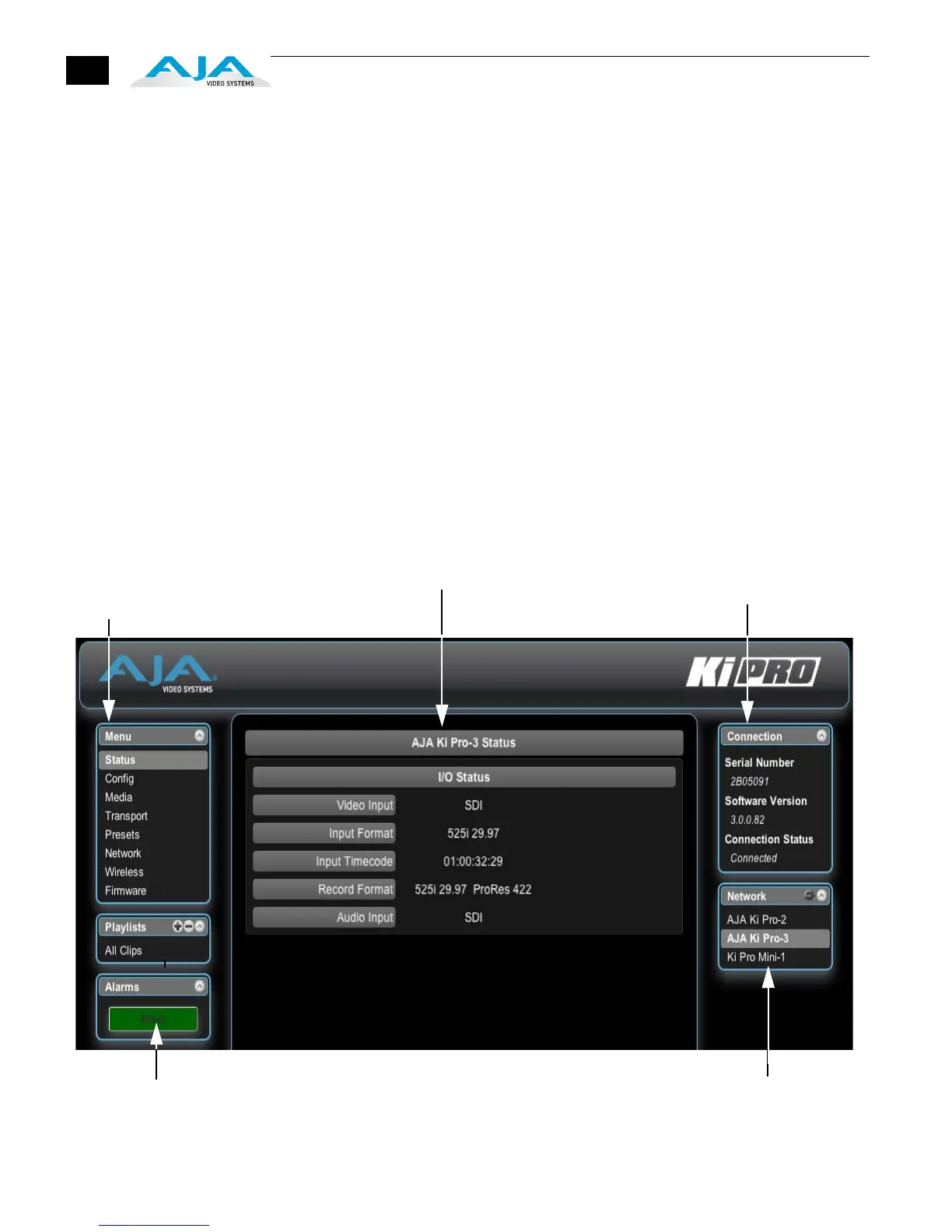 This area shows the connection status in addition to the Ki Pro’s serial number and