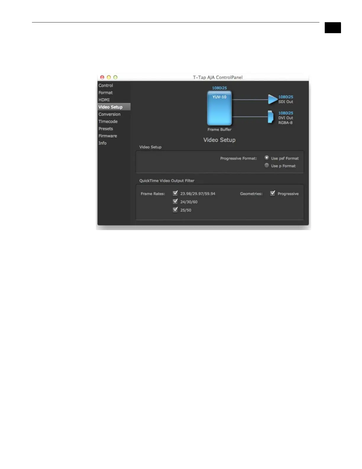 AJA Control Panel, Video Setup Screen