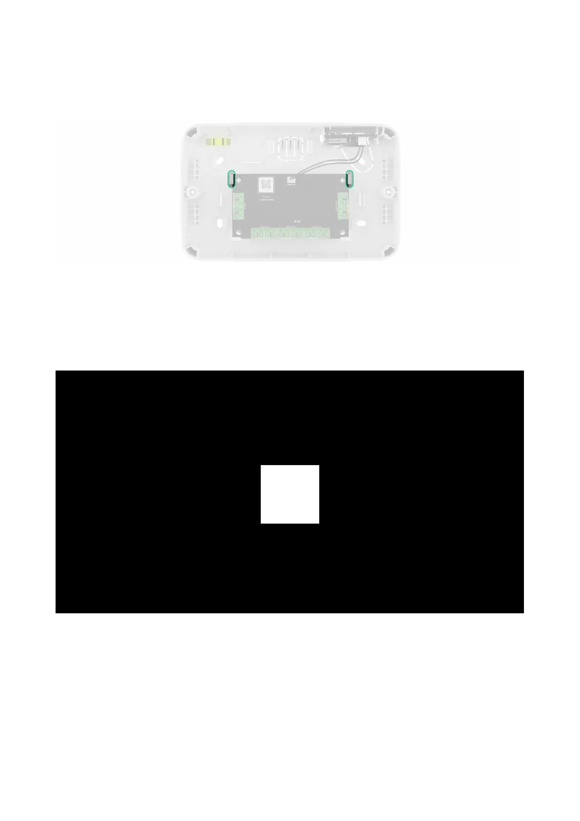 The casing has a tamper board. It connects to the Ajax device with a wire in the