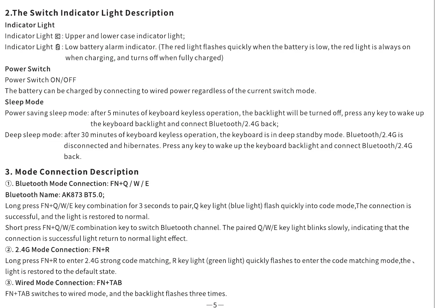 disconnected and hibernates. Press any key to wake up the keyboard backlight and connect Bluetooth/2.4G