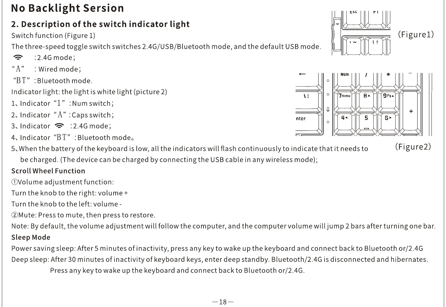 Power saving sleep: After 5 minutes of inactivity, press any key to wake up the keyboard and connect back to Bluetooth or/2.4G