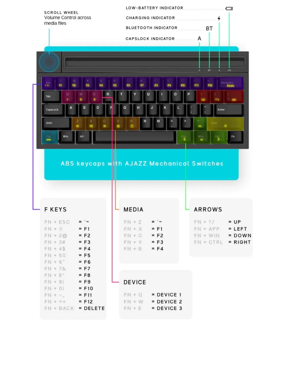 AJAZZ K620T - Keyboard Overview; Key Function Mapping; Device Switching