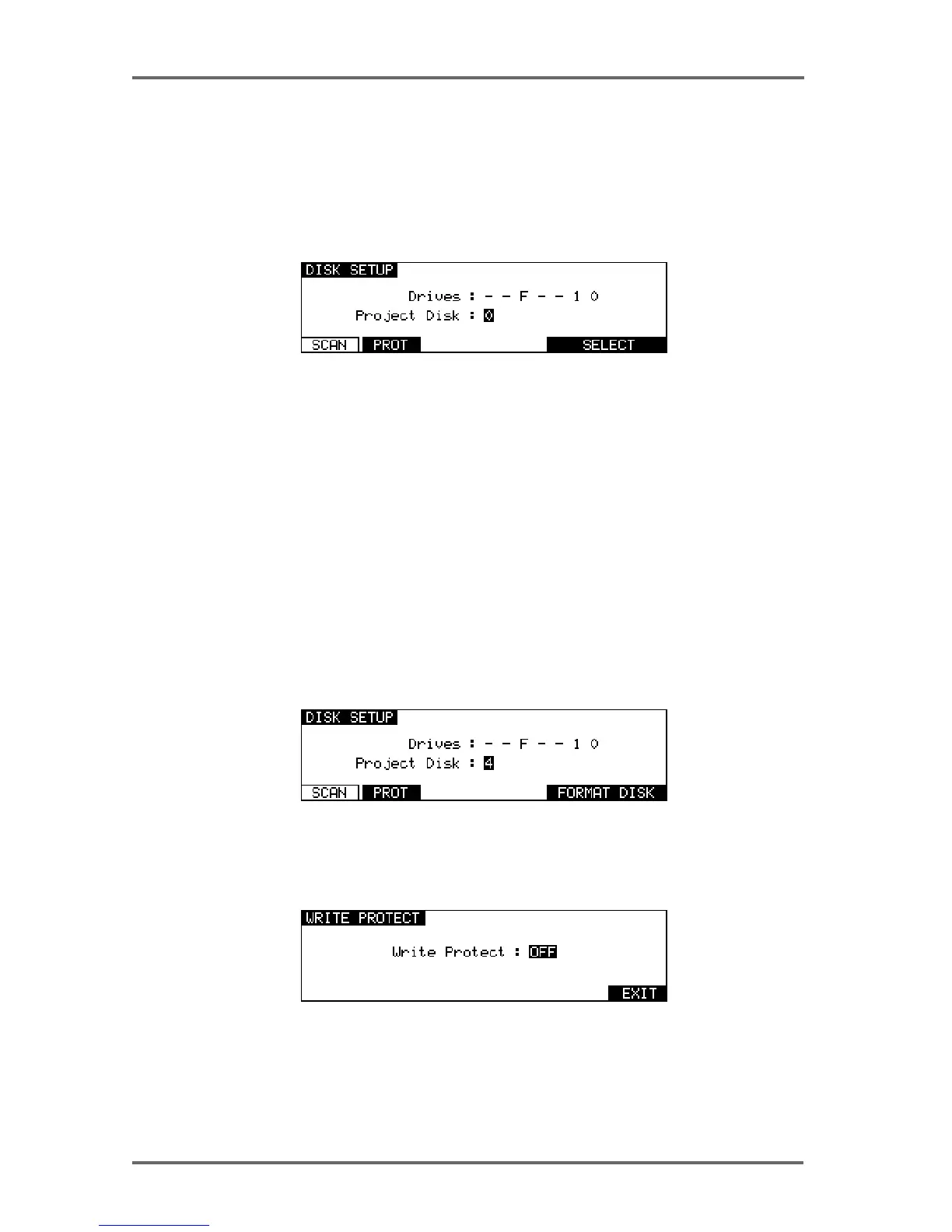 Pressing the PROT key (F2) on the DISK SETUP page will take you to the WRITE PROTECT